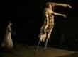 Mantova street burst into flame again thanks to Teatr A PART. On Sunday night polish theatre group showed El Niňo performance. Two gigantic movable constructions on two sides of a square marked out a space assigned for the stage, giving the actors opportunity to use different scenic means. Stilts, smoke, water and fire became a basic elements to create a symbolic transmission - metaphors of violence and abuse, which a man is willing to do so often. Commonness of existence of man and woman, presented at the beginning of the performance is absorbed by a maelstrom of misfortune, balancing from pervert sexuality to a loneliness of fright. El Niňo refers to stylistics of Romans "pirriche", to sensitize a spectator by bloody images and acts, wild sexuality, bringing reminiscence of a cruel incidents of 20th century.
