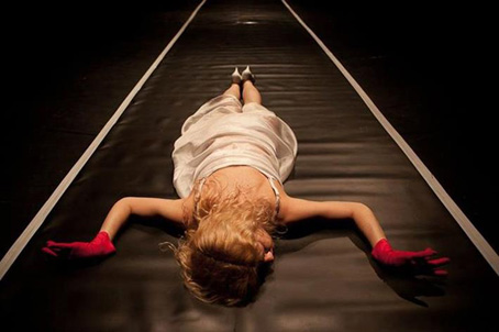 W chwili przestąpienia przez taśmę Ofelia wstępuje w toń szaleństwa, z której już później nie będzie mogła się wydostać. Najpierw stąpa pewnie po podłodze, jednak stopniowo traci kontrolę nad ruchami, jej ciałem wstrząsają drgawki, a podejmowane próby ucieczki z zamkniętej przestrzeni kończą się niepowodzeniem. Kiedy Ofelia opowiada o obietnicach złożonych przez duńskiego księcia i o swojej naiwności, zakłada czerwone rękawiczki i mocno obejmuje samą siebie, Odtwarzając wspomnienia, przypomina sobie intymną relację, która łączyła ją z Hamletem.