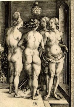 Jedna z najsłynniejszych rycin Albrechta Dürera to „Cztery nagie kobiety” (lub „Cztery czarownice”). W ciasnym, pustym pokoju stoją cztery nagie kobiety. Każda z nich jest ustawiona inaczej wobec widza, a ich spojrzenia skierowane są ku czemuś niewidzialnemu. Jedna ma małą głowę na dużym ciele i surowy, regularny, prawie klasyczny profil. Druga ma łagodnie wyprofilowaną, ładną twarz z wyrazem cierpienia, a jej ciało jest młodsze niż reszty. Trzecia odwrócona jest do nas plecami – jej twarz nie jest widoczna. Czwarta, która jest na wpół ukryta za resztą, ma rustykalną twarz z niesamowicie ciasnymi wargami. Ich ciała są ciężkie. Obraz interpretowano czasem jako przedstawienie Afrodyty (tyłem) i jej trzech służek, Gracji, które często wyobrażano nago. Choć ideały piękna zmieniają się, to wydaje się, że Dürer nie miał zamiaru przedstawić idealnych piękności w tym grawerowaniu. Naturalność i żywiołowość przedstawionych na obrazie ciał sprawia, że nie myślimy o starożytnych Gracjach, ale raczej o żywej naturze. W owych czasach mężczyźni i kobiety często odwiedzali łaźnie razem. Dürer prawdopodobnie inspirował się obserwowanymi tam kobietami, które mogły mu również pozować nago. Pod stopami kobiet leży kość i czaszka, zaś zza drzwi wygląda poczwara (diabeł?). Nad ich głowami znajduje się okrągła lampa z datą i trzema tajemniczymi literami „OGH”, które interpretuje się na różne sposoby, ale żadna z interpretacji nie wydaje się przekonująca. Nie wiadomo nawet, czy za tymi literami ukryte są niemieckie czy łacińskie słowa. Ich znaczenie pozostaje utracone na zawsze.